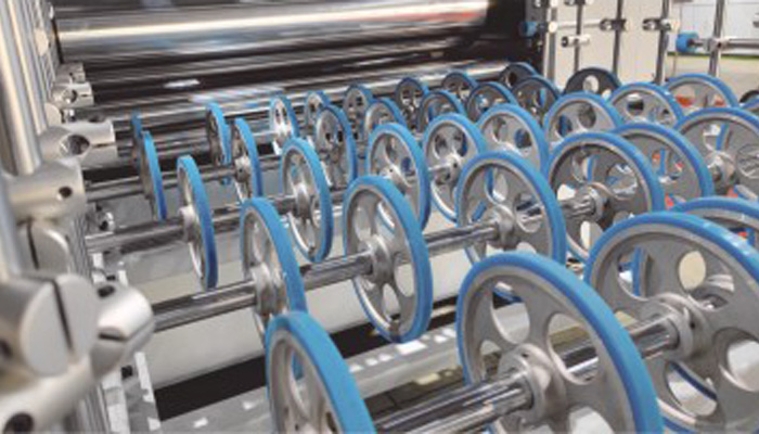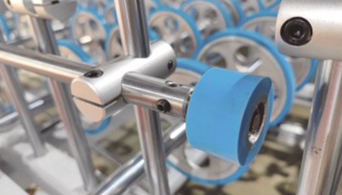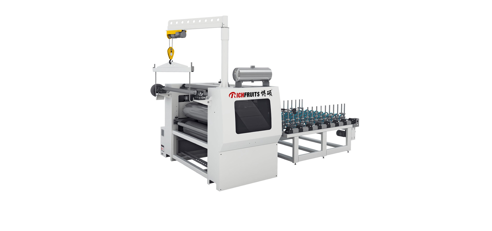 配置兩輥壓貼輥,一組膠輥和一組鋼輥;配膜張緊裝置;配電動吊葫蘆,實現膜吊裝上線;包覆輥可整體單邊調節移動,快速調整尺寸。