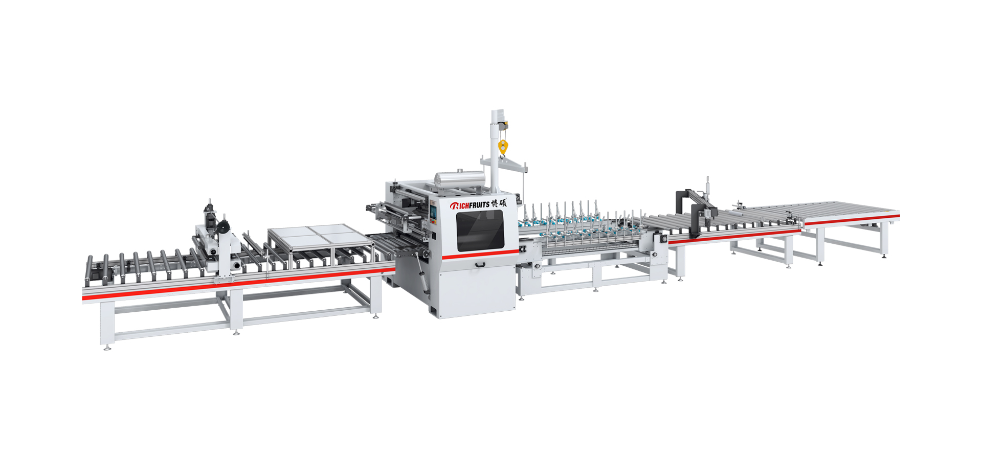 本生產(chǎn)線(xiàn)由:龍門(mén)上下料機(jī) — 對(duì)中輸送機(jī) — 粉塵清除機(jī) — PUR涂膠機(jī) — 恒溫隧道 — 平貼包覆機(jī) — 斜切機(jī) — 對(duì)中輸送機(jī) — 龍門(mén)上下料機(jī)等部分組成。