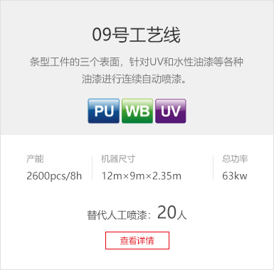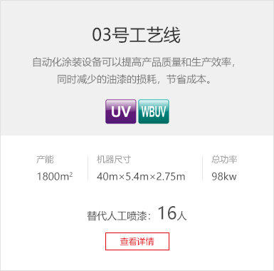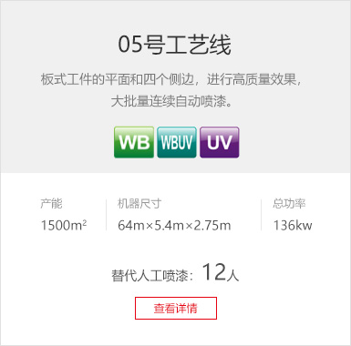工藝要求 UV底漆、水性色漆、水性LED-UV面漆 產品種類 膜壓PVC櫥柜門板、定制衣柜、線條 產線數量 4條 設備特色 LED-UV固化系統、立體干燥房配1臺,待干45分鐘 生產產能 UV底漆噴涂線:1800m2/8h ( 生產員3人/線)