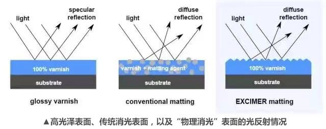 UV涂料配方中的丙烯酸酯雙鍵在吸收172納米紫外光后,可生成自由基而可以無需光引發劑。同時172納米UV的穿透深度僅為100到500納米,因此涂料只有表面極薄的一層被固化。這一薄層的聚合和交聯,會發生收縮而形成不光滑的表面,并漂浮在未固化的下層液體上,達到表面啞光的效果。不過這個固化需要在氮氣環境下進行,使操作環境的氧氣濃度低于100ppm。后續再采用常規UV或者電子束進行完全固化。