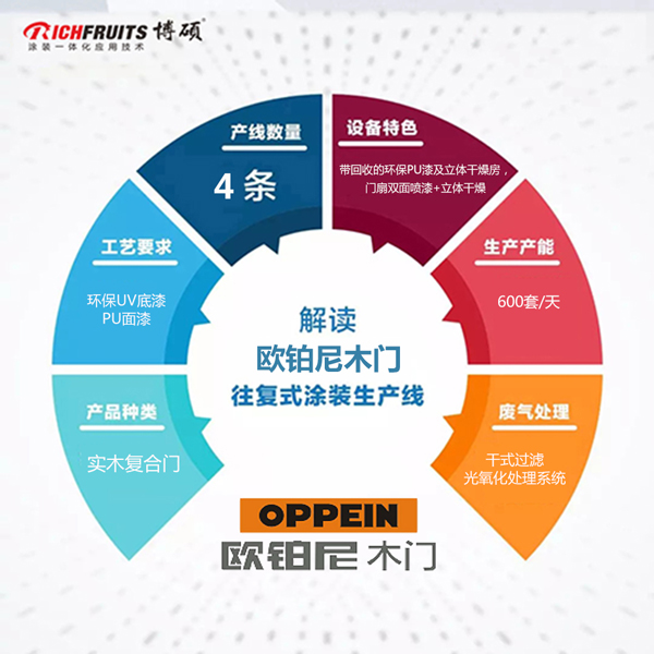 歐鉑尼木門運用博碩實木復合門PU&WB自動噴涂+立體干燥生產線,配置兩臺噴漆機和一臺翻面機,雙面一次性完成噴涂,能夠對涂料進行回收利用,可以噴涂PU\NC\WB。