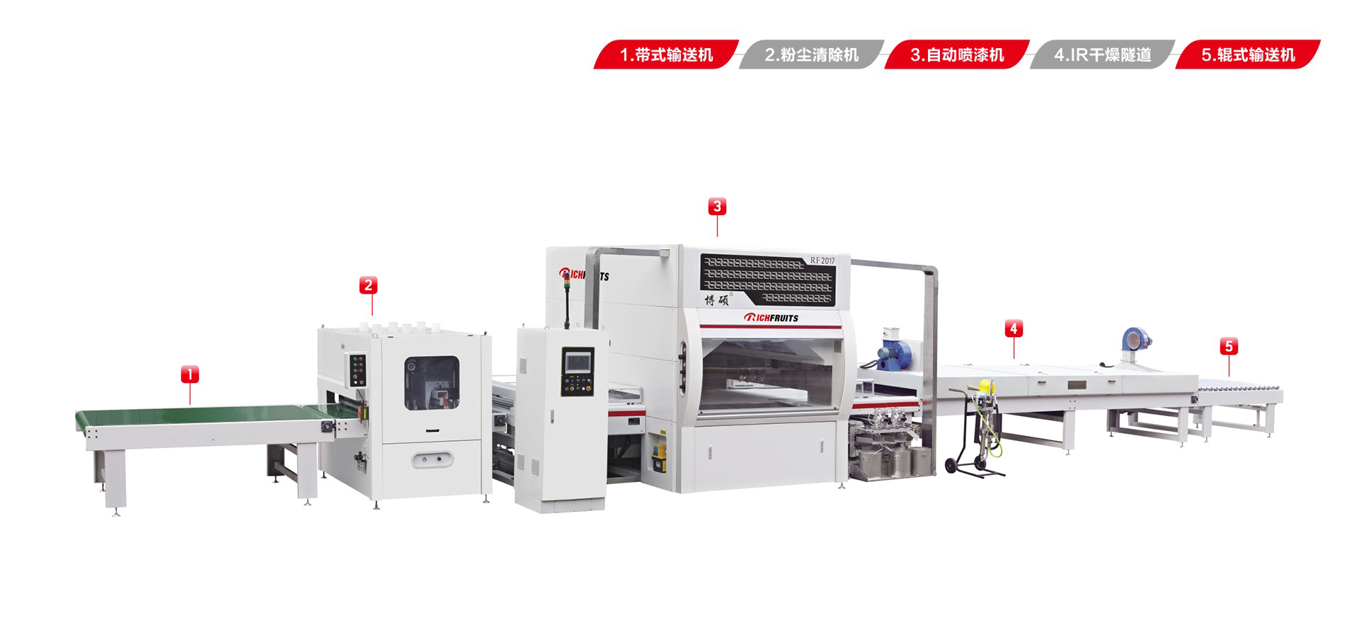 適用于板式家具、實木門、櫥柜門、工藝品、裝飾板、硅酸鈣板、玻鎂板、水泥纖維板的板式加工件的平面和四個側邊進行高質量、大批量連續噴漆。